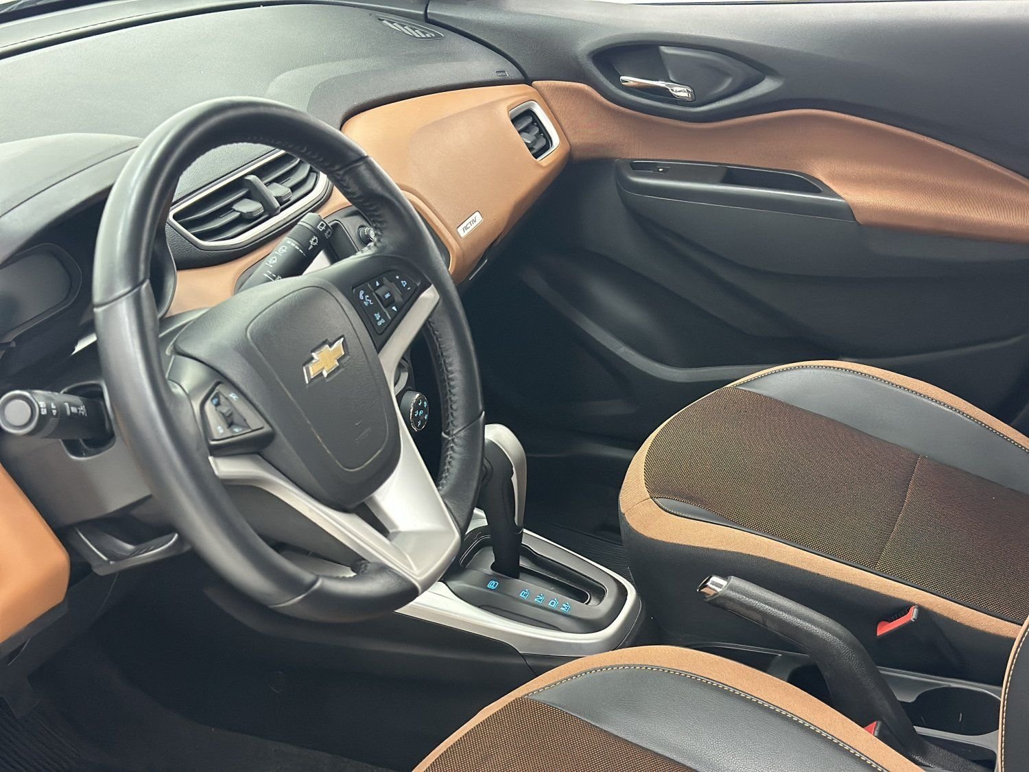 O Onix Hatch Activ 2017 é uma versão com apelo aventureiro do compacto mais vendido da Chevrolet. Com 84.300km rodados originais, nosso Onix se destaca visualmente por uma série de elementos exclusivos que remetem ao estilo off-road urbano, como os para-choques redesenhados com molduras pretas, as molduras nas caixas de roda, a suspensão ligeiramente elevada e os pneus de uso misto, que reforçam sua proposta mais robusta dando um aspecto mais moderno e esportivo. Os bancos trazem revestimento exclusivo com costuras aparentes e detalhes em cores contrastantes, harmonizando com o painel, que possui acabamento em dois tons, além de trazer sistema multimídia com android auto e apple car play, volante multifuncional, vidros e travas elétricas, freios ABS com EBD, sensor de chuva, 2 airbags, sensor de estacionamento, câmera de ré, computador de bordo, piloto automático entre outros itens da versão. O modelo se sobressai em termos de praticidade, oferecendo bom espaço interno para um hatch compacto, além de um porta-malas com capacidade de 280 litros, o que é suficiente para o dia a dia ou pequenas viagens. É um conjunto que oferece bom desempenho para uso urbano e eficiência no consumo de combustível.